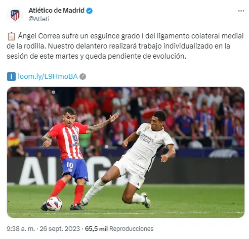 “Ángel Correa sufre un esguince grado I del ligamento colateral medial de la rodilla. El internacional argentino se ha sometido a una resonancia que ha confirmado la lesión. Nuestro delantero realizará trabajo individualizado en la sesión de este martes y queda pendiente de evolución” dice el parte médico.