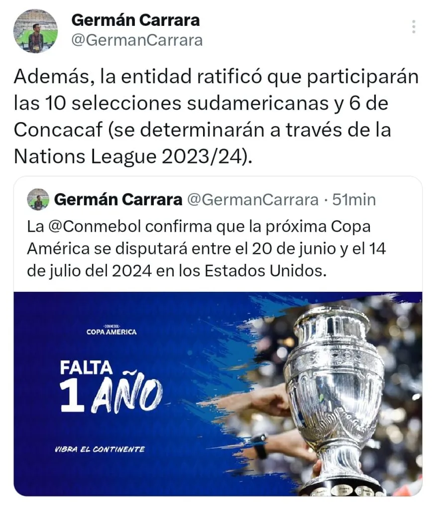 ”La CONMEBOL Copa America 2024 comenzará el 20 de junio y finalizará el 14 de julio de 2024, consolidando 25 días de competencia”, confirmó en su sitio web la confederación que tiene base en Luque, Paraguay. Asimismo, ratificó que el torneo, además de contar con las 10 selecciones sudamericanas, tendrá 6 participantes invitados de la Concacaf.