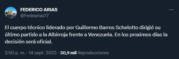 El periodista Federico Arias aseguró que Guillermo Barros Schelotto dirigió su último partido al frente de la Albirroja ante Venezuela el pasado martes 12 de septiembre. Esto también fue confirmado por el comunicador Bruno Pont, quien había dicho en las últimas horas que el presidente de la Asociación Paraguaya de Fútbol (APF), Robert Harrison, evaluaría recién su continuidad después de la fecha FIFA de octubre.
