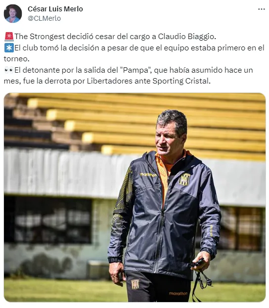 Aunque The Strongest lidera además en la División Profesional de Bolivia, el desencadenante habría sido la caída como local ante Sporting Cristal por el torneo de Conmebol, tal como explicó César Luis Merlo. Ante los peruanos, perdieron la ventaja inicial y quedaron últimos en su zona.