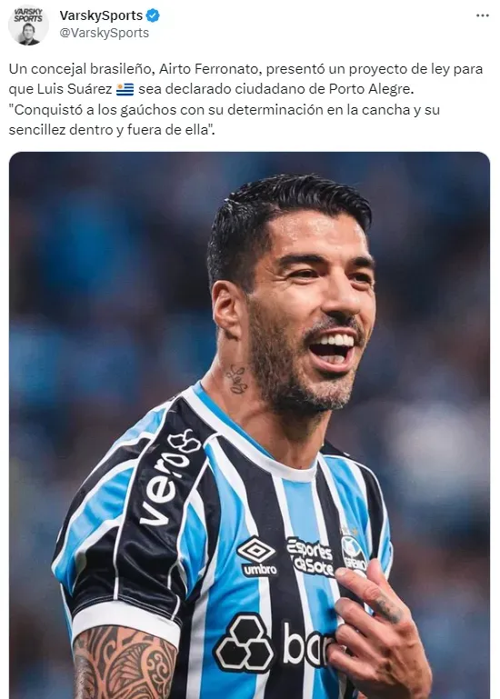 El atacante uruguayo está revolucionando a Porto Alegre y los fanáticos de Gremio se ilusionan con lo que puedan conseguir de la mano del uruguayo. En ese contexto, el concejal Airto Ferronato presentó un proyecto de ley para que Suárez sea ciudadano de aquella ciudad del estado de Rio Grande do Sul.