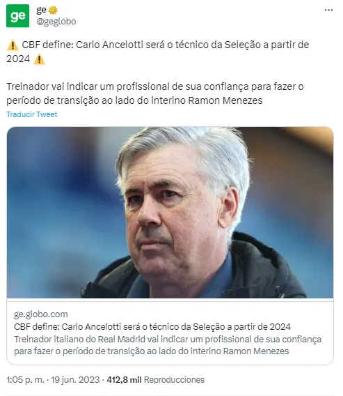 La fuente asegura que Carlo Ancelotti será el entrenador de la pentacampeona del mundo a partir de junio de 2024, cuando cumpla su ciclo con Real Madrid. La Casa Blanca ya estaría al tanto del acuerdo y todo pasará a ser formal a partir de el próximo mes de enero, cuando el italiano entre en los últimos 6 meses de contrato.