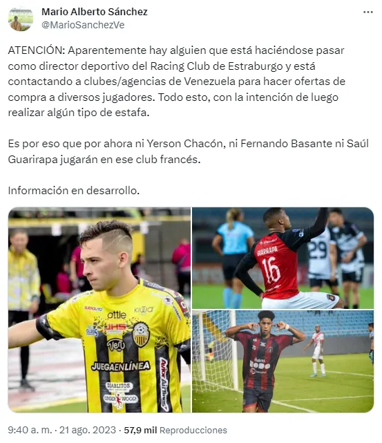 Según informa Mario Alberto Sánchez, todo podría tratarse de una estafa. “Aparentemente hay alguien que está haciéndose pasar como director deportivo del Racing Club de Estrasburgo y está contactando a clubes/agencias de Venezuela para hacer ofertas de compra a diversos jugadores. Todo esto, con la intención de luego realizar algún tipo de estafa“.