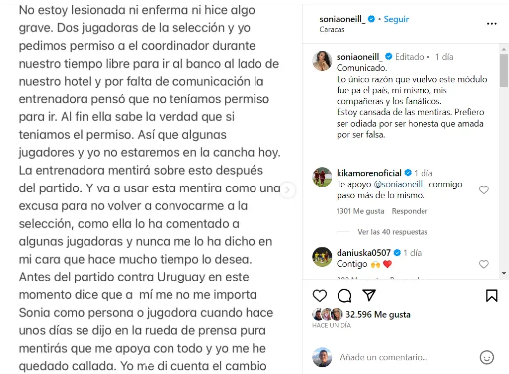 En su comunicado, la jugadora explicó que, junto con dos compañeras, solicitó el permiso del coordinador de la Selección de Venezuela para abandonar la concentración para hacer un trámite en el banco. O’Neill asegura que Pamela Conti sabía del permiso, pero aún así decidió sacarla de la convocatoria.