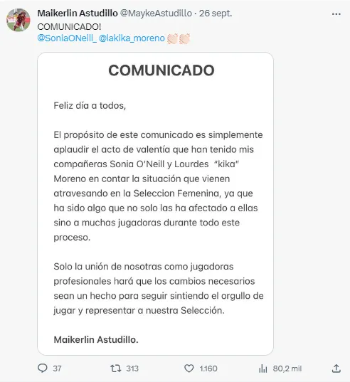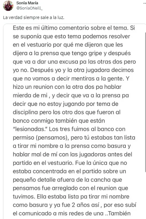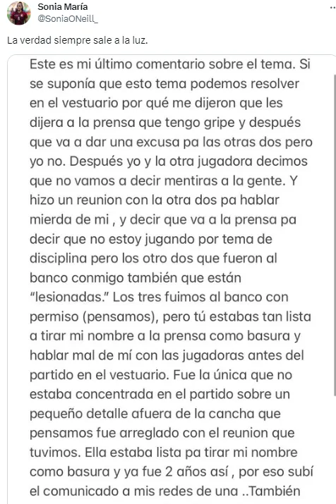 “Prefiero ser odiada por ser honesta que amada por ser falsa. Hay mucho que me he guardado por meses y estoy cansada. Sé que algunas jugadoras van a apoyarla a ella porque no tienen otra opción si ellas quieren seguir jugando por nuestro país y entiendo. Pero como dije, prefiero decir la verdad y sufrir las consecuencias” añadió.