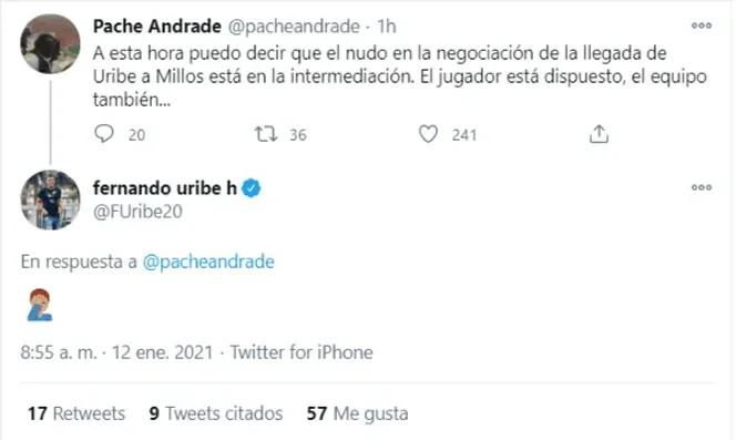 Por eso, el pasado lunes 11 de enero se hizo viral en Twitter la información de que Millonarios ya habría iniciado negocociaciones con Fernando Uribe. El encargado de soltar la primicia en las redes sociales fue el periodista, Guillermo Arango.