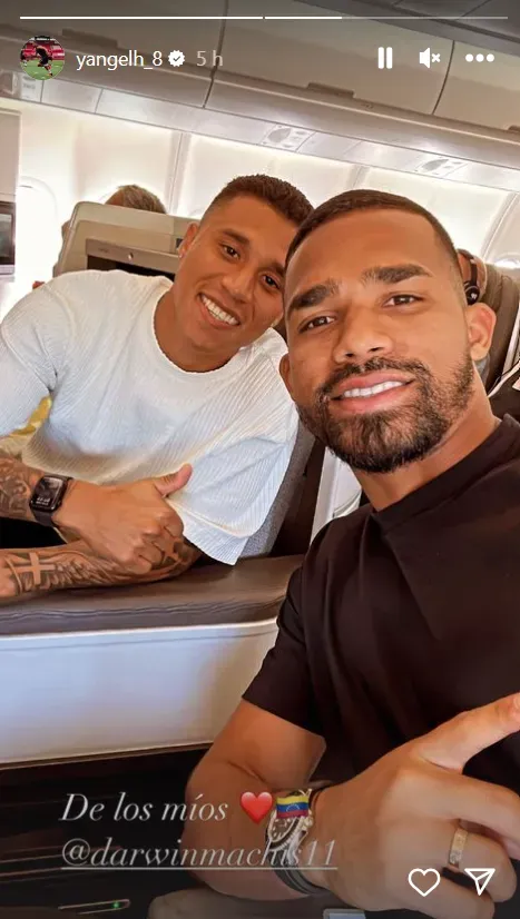 La patada de Machís a Yangel Herrera se dio a solo unos días de la doble fecha de Eliminatorias de la Selección de Venezuela. Es por eso que muchos temían que pudieran quedar asperezas entre los jugadores tras lo ocurrido. No obstante, el mediocampista dio por cerrado el asunto con una foto junto a su compañero en el avión. “De los míos” dice su historia en Instagram.