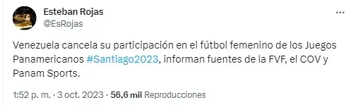 De acuerdo con el periodista, Esteban Rojas, la Selección de Venezuela ha cancelado su participación en los próximos Juegos Panamericanos, que se celebrarán en la ciudad de Santiago de Chile desde el próximo 20 de octubre hasta el 5 de noviembre.