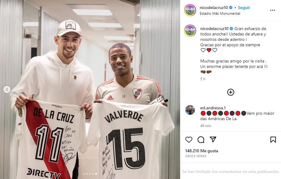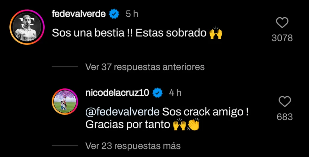 En los comentarios, Valverde se hizo presente con un elogio para De La Cruz: “¡Sos una bestia! Estás sobrado“. Entre decenas de comentarios de hinchas que le pedían al Merengue que se pusiera la banda, el jugador de River volvió a agradecerle: “Sos crack amigo. Gracias por tanto“. Juntos, este jueves fueron a alentar a Uruguay en el Mundial Sub 20, con la Celeste clasificándose a la final ante Israel.