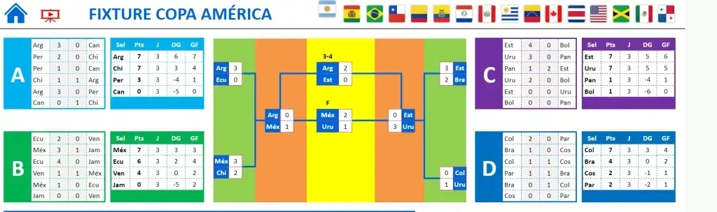 En los cruces de cuartos de final, también realiza tus pronósticos para que el documento te haga los cruces de semifinal y la gran final. El usuario Excel Power fue el diseñador de este simulador.