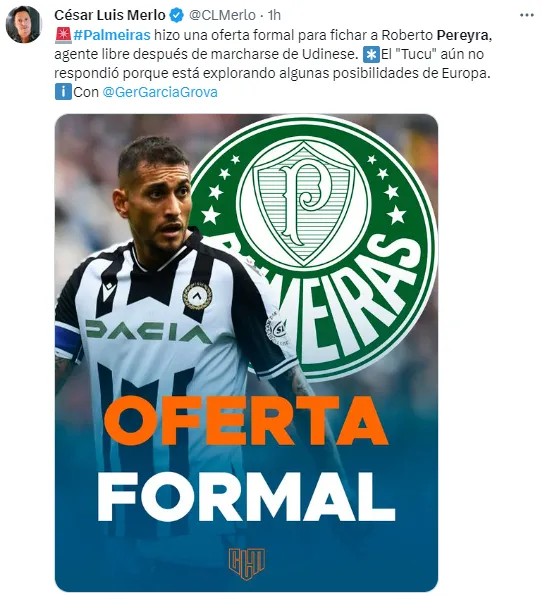 Según informó este martes César Luis Merlo, el club paulista está tras los pasos de Roberto Pereyra y ya le envió una oferta formal. El argentino viene de militar en Udinese, pero su contrato finalizó y se encuentra en la agencia libre decidiendo dónde continuar su carrera.