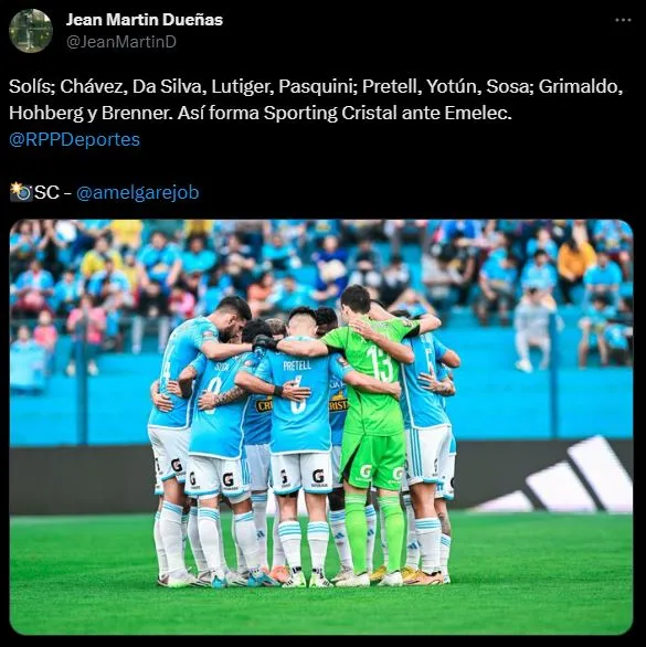 “Solís; Chávez, Da Silva, Lutiger, Pasquini; Pretell, Yotún, Sosa; Grimaldo, Hohberg y Brenner. Así forma Sporting Cristal ante Emelec”. Expone el periodista deportivo de RPP Noticias. Con esto ya sabemos bien, cómo estará jugando hoy el cuadro rimense en Copa Sudamericana.