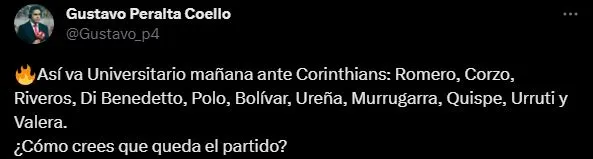 La información específica es de Gustavo Peralta, quien contó cómo se maneja todo en Universitario de Deportes. Este será el 11 titular para jugar contra el cuadro capitalino: “Romero, Corzo, Riveros, Di Benedetto, Polo, Bolívar, Ureña, Murrugarra, Quispe, Urruti y Valera”. ¿Harías algún cambio?