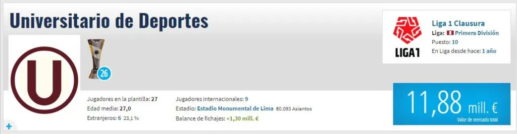 Gracias a la información por parte de Transfermarkt, podemos notar datos objetivos basándonos en el plantel que tienen los merengues de cara al partido por Copa Sudamericana. La “U” tiene un conglomerado valorizado en 11,88 millones de euros aproximadamente.
