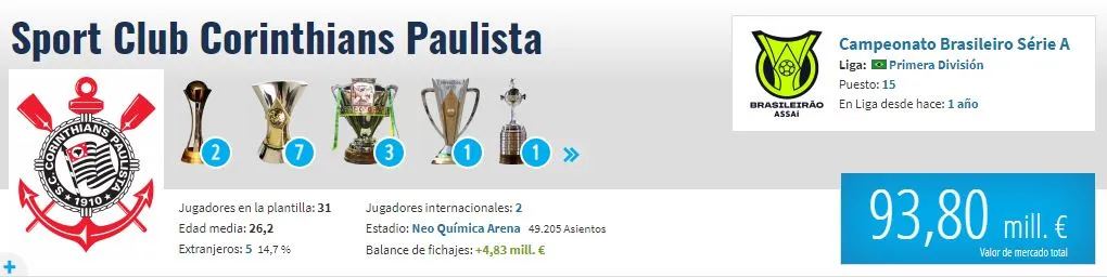 Por su lado, Corinthians de Brasil cuenta con una plantilla 93,80 millones de euros aproximadamente, según expone Transfermarkt. Y sus mejores intérpretes son: Yuri Alberto con 18 millones. Róger Guedes con 8,50 millones. Fausto Ver 8 millones. Maycon, junto a Adson, con 6 millones. ¿Esto pesará a la hora del duelo? Veremos cómo va ese tema.