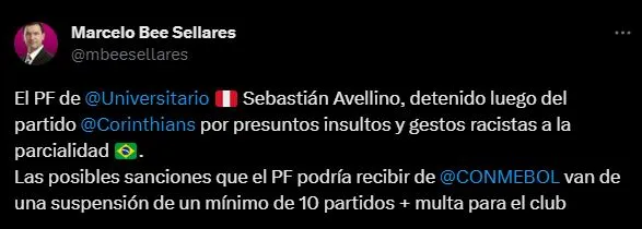 Lo que cuenta el popular abogado, Marcelo Bee Sellares, es claro: “El PF de Universitario, Sebastián Avellino, detenido luego del partido vs. Corinthians, por presuntos insultos y gestos racistas a la parcialidad. Las posibles sanciones que el PF podría recibir de CONMEBOL, van de una suspensión de un mínimo de 10 partidos + multa para el club”.