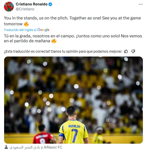Por eso, el Bicho, a tan solo un día del encuentro que tendrá lugar en el Al -Awwal Park de Riad a las 19 horas CET, utilizó el poder de alcance de sus cuentas de redes sociales e hizo un pedido especial a los aficionados del Al Nassr. ”Tú en la grada, nosotros en el campo. ¡Juntos como uno solo! Nos vemos en el partido de mañana”.