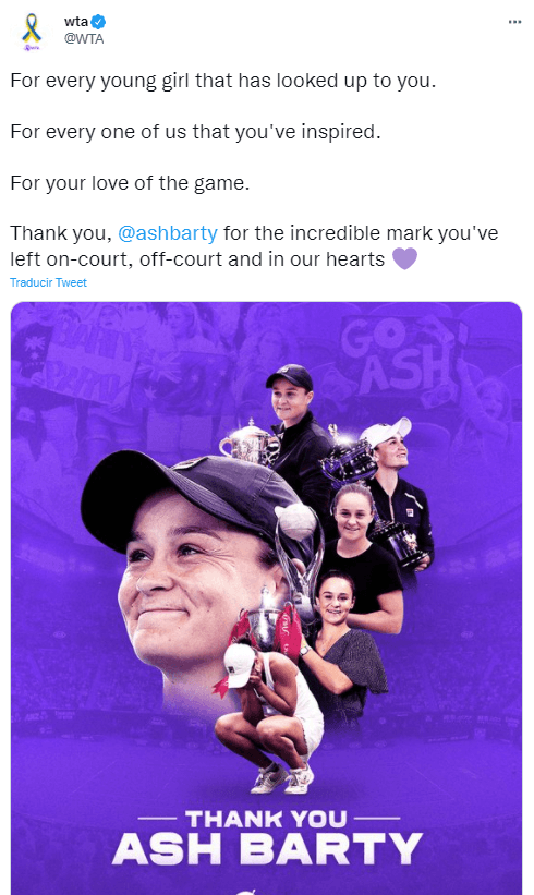 La WTA la homenajeó rápidamente con un mensaje en redes: “Por cada niña que te ha admirado.Para cada uno de nosotros que has inspirado.Por tu amor al juego. Gracias Ashleigh Bartypor la increíble huella que has dejado en la cancha, fuera de la cancha y en nuestros corazones“.