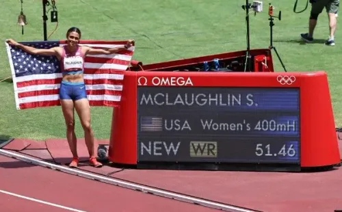 En la misma modalidad de 400 metros vallas con 51.46 segundos, la estadounidense se quedó con el récord mundial.