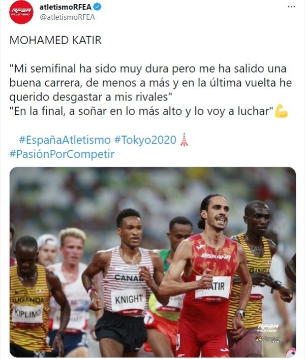 Este viernes 6 de agosto, Katir Mohamed disputará la gran final de los 5000metros del Atletismo masculino porlosJuegos Olímpícos Tokio 2020, el cual tendrá lugar desdeel Estadio Olímpicode Tokio.