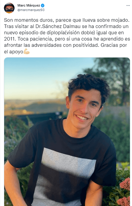 “Son momentos duros, parece que llueva sobre mojado. Tras visitar al Dr.Sánchez Dalmau se ha confirmado un nuevo episodio de diplopía (visión doble) igual que en 2011. Toca paciencia, pero si una cosa he aprendido es afrontar las adversidades con positividad. Gracias por el apoyo“, escribió Márquez en sus redes.