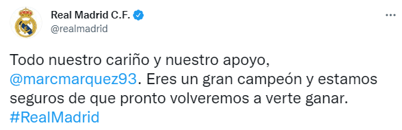 En Real Madrid, conmocionados por la noticia, no dudaron en salir a apoyar al español y publicaron palabras de aliento para el piloto en su recuperación: “Todo nuestro cariño y nuestro apoyo, Marc Márquez. Eres un gran campeón y estamos seguros de que pronto volveremos a verte ganar“.
