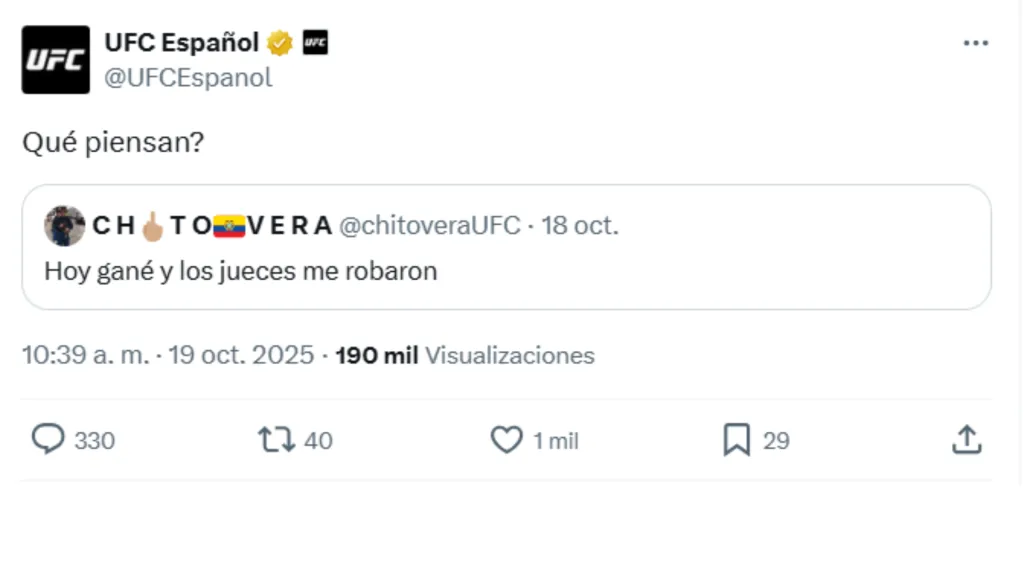 Desde la cuenta oficial de la UFC en español le respondieron al peleador ecuatoriano con dos palabras: “Qué piensan?“, escribió la cuenta en sus redes sociales, restándole seriedad a la acusación del ecuatoriano y generando varias respuestas.