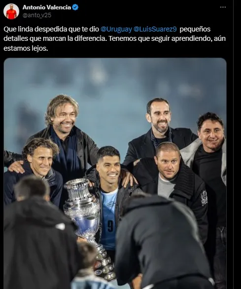 Aprovechando el homenaje de la Selección de Uruguay a Luis Suárez, Antonio Valencia dijo en su cuenta de X (antes Twitter): “Que linda despedida que te dio Uruguay, Luis Suárez pequeños detalles que marcan la diferencia. Tenemos que seguir aprendiendo, aún estamos lejos”.