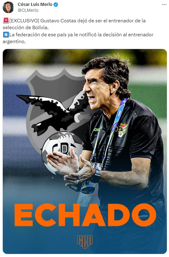 Pero, a pesar de estas instancias tempranas, la competencia ya cuenta con un nuevo entrenador despedido. Se trata de Gustavo Costas, a quien le comunicaron que ya no dirigirá a la Selección Boliviana. El periodista César Luis Merlo lo adelantó este lunes a falta del anuncio oficial por parte de la federación.