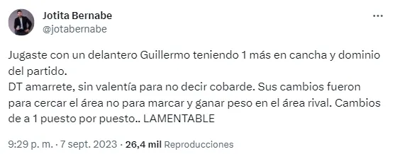 “Pésima lectura de Guillermo. Él perdió estos puntos hoy“, Jugaste con un delantero Guillermo teniendo uno más en cancha y dominio del partido” y “Ya basta de los mellizos“: algunas de las frases más fuertes que le dedicaron al entrenador.