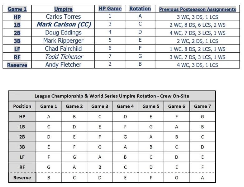 MLB has named Mark Carlson as the crew chief for the seven umpires working the 2024 World Series between the New York Yankees and the Los Angeles Dodgers. Joining him are Doug Eddings, Chad Fairchild, Andy Fletcher, Mark Ripperger, Todd Tichenor, and Carlos Torres.