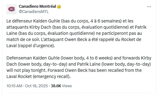 “Defenseman Kaiden Guhle (lower body, 4 to 6 weeks) and forwards Kirby Dach (lower body, day-to-day) and Patrik Laine (lower body, day-to-day) will not play tonight. Forward Owen Beck has been recalled from the Laval Rocket (emergency recall).” via Canadiens on “X”,