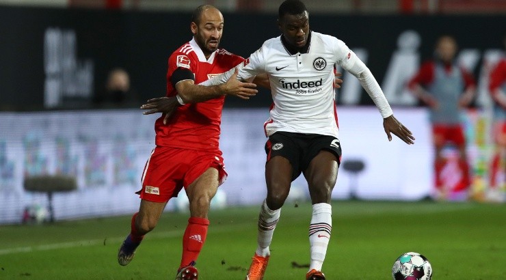 Akaki Gogia of Union Berlin (left) battles for possession with Evan Ndicka of Eintracht Frankfurt (right). (Getty)