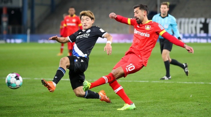 Kerem Demirbay of Bayer Leverkusen (right) shoots under pressure from Reinhold Yabo of Arminia Bielefeld (left). (Getty)