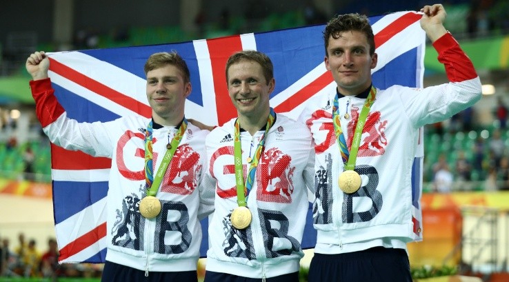 Great Britain’s Men’s Team Sprint Track Cycling celebrate after winning gold at the 2016 Rio Olympics. (Gtty)