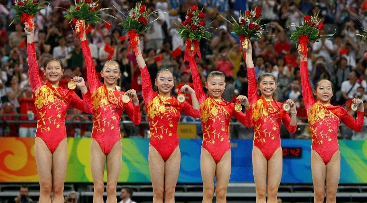 The Chinese women’s gymnastics team celebrates after winning the gold at the Beijing 2008 Olympic Games. (Getty)