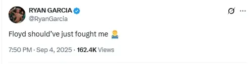 In a post on “X” (formerly Twitter), Garcia wrote: “Floyd should’ve just fought me,” ending the message with a shrug emoji. The response was shared widely across boxing circles, highlighting the ongoing tension and excitement surrounding Mayweather’s exhibition matches.