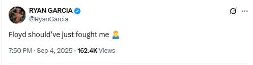 In a post on “X” (formerly Twitter), Garcia wrote: Floyd should’ve just fought me,” ending the message with a shrug emoji. The response was shared widely across boxing circles, highlighting the ongoing tension and excitement surrounding Mayweather’s exhibition matches.