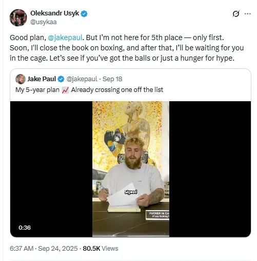 “Good plan, Jake Paul, but I’m not here for 5th place—only first. Soon, I’ll close the book on boxing, and after that, I’ll be waiting for you in the cage. Let’s see if you’ve got the balls or just a hunger for hype,” Usyk wrote on X.