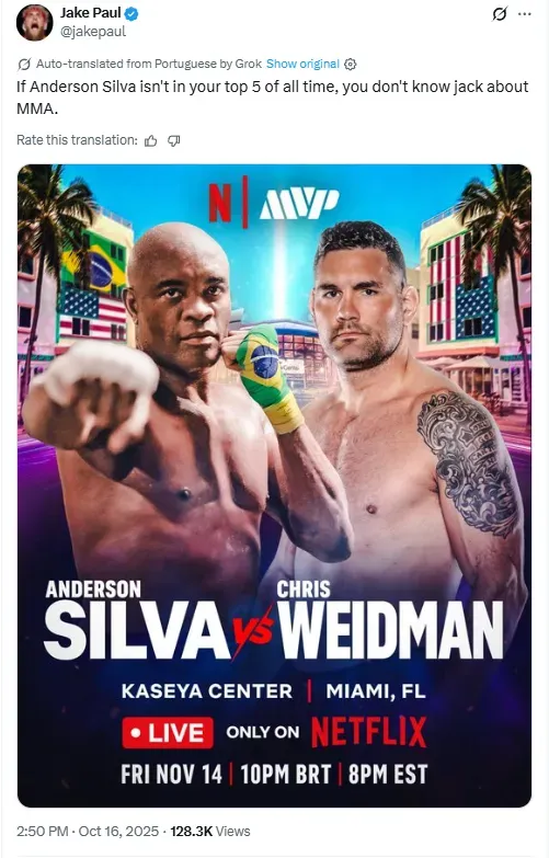 Paul, who shared the ring with “The Spider” back in 2022, has consistently shown admiration for the Brazilian legend. This week, when it was announced that Silva would complete his trilogy against Chris Weidman, Paul took to social media to make his feelings unmistakably clear.