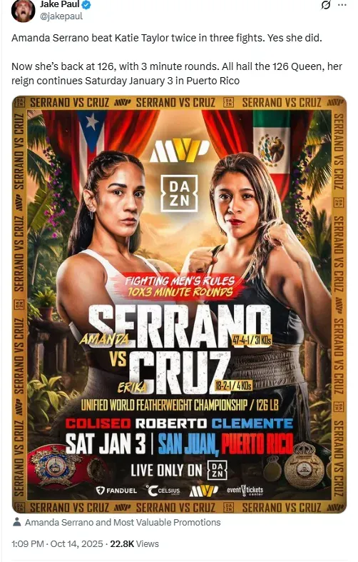 “Amanda Serrano beat Katie Taylor twice in three fights. Yes she did,” Paul posted on X, adding, “Now she’s back at 126, with 3-minute rounds. All hail the 126 Queen, her reign continues Saturday January 3 in Puerto Rico.”
