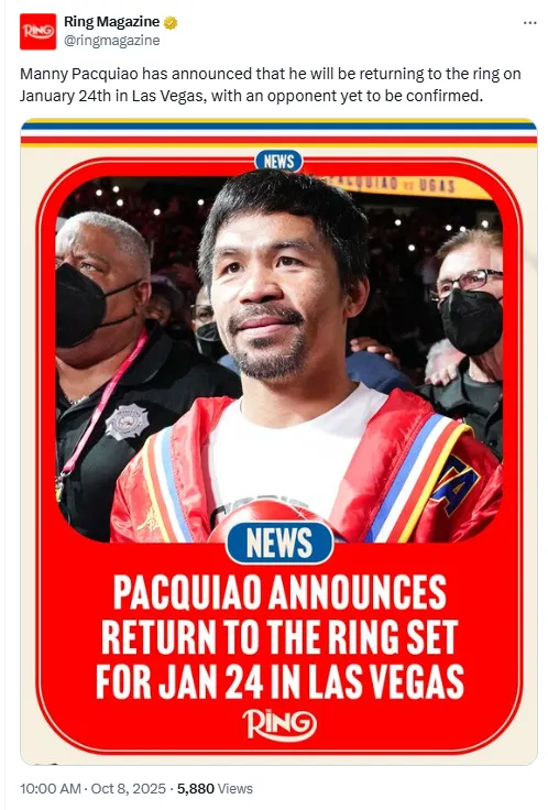 The boxing world is buzzing as Manny Pacquiao confirms his return to the ring. The Filipino legend will step back into action on January 24, 2026, in Las Vegas, bringing excitement to fans eager for a new chapter in his storied career. While the venue and date are now official, Pacquiao has yet to reveal his opponent, leaving speculation running wild.