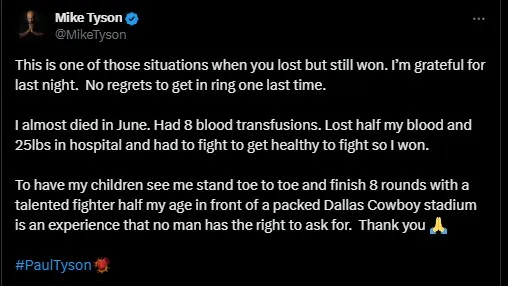 Despite previously hinting at a possible fight with Logan Paul, Tyson made an unexpected move and announced his definitive retirement on social media. āThis is one of those situations when you lost but still won. Iām grateful for last night. No regrets to get in ring one last time,ā Tyson wrote.