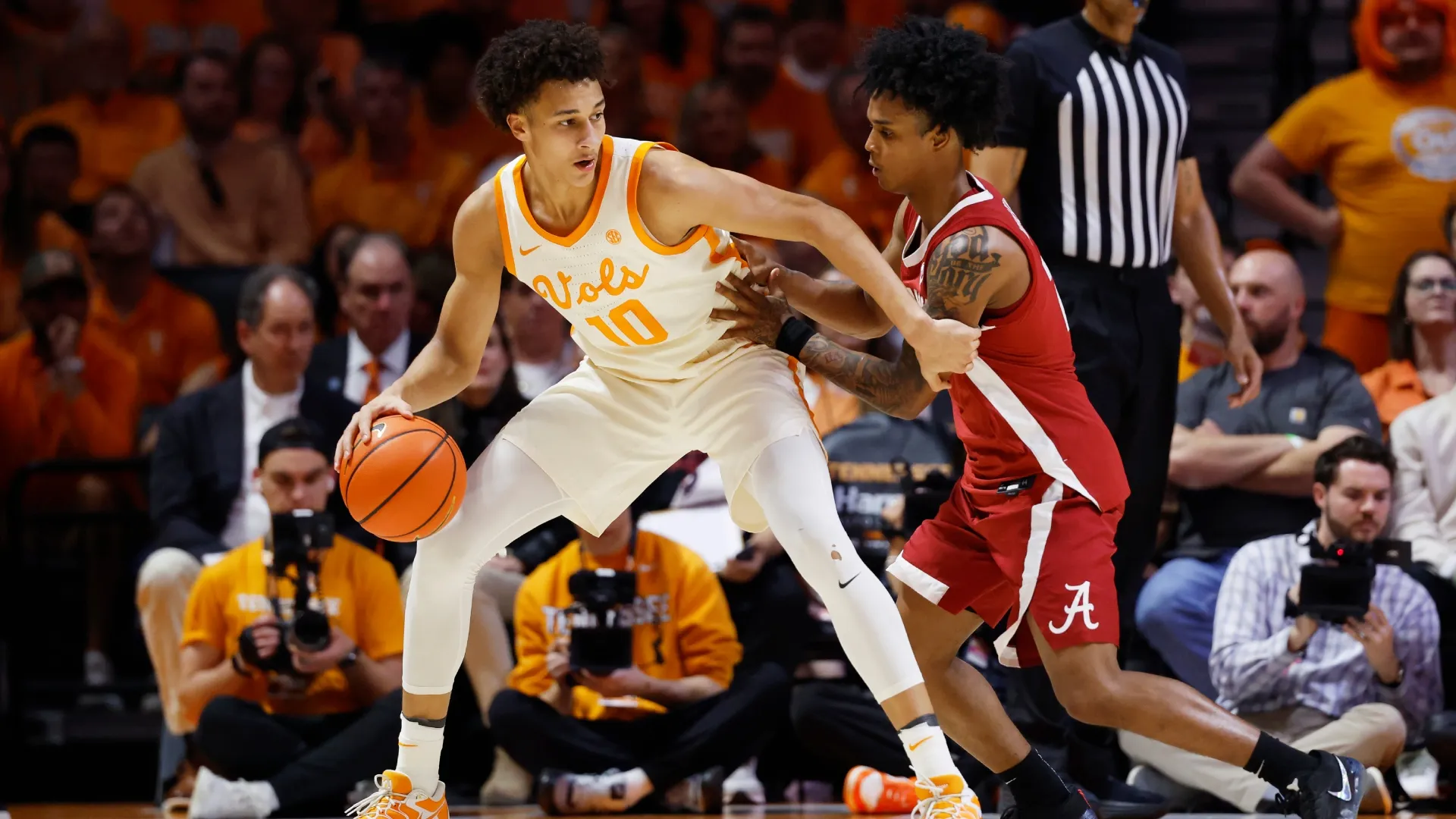Nate Ament suffered a right-leg injury during Tennessee’s game against Alabama on February 28, forcing him to miss multiple games before the SEC Tournament. It occurred during a scramble for a loose ball when an Alabama player dove into his leg, causing it to bend awkwardly.