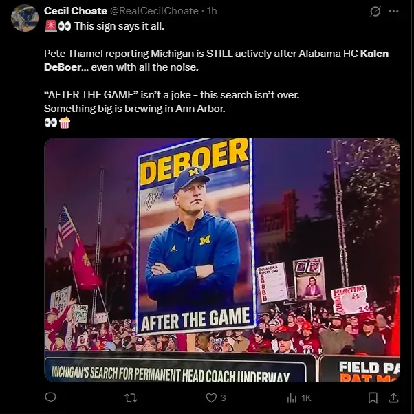 “Sources tell me that Michigan officials remain conviced that they want to attempt to hire Alabama head coach Kalen DeBoer,” Thamel said during a College GameDay segment. “The result of tonight’s game is going to factor heavily into that pursuit, as an Alabama loss would make the logistics of attempting to hire DeBoer much more tenable.”