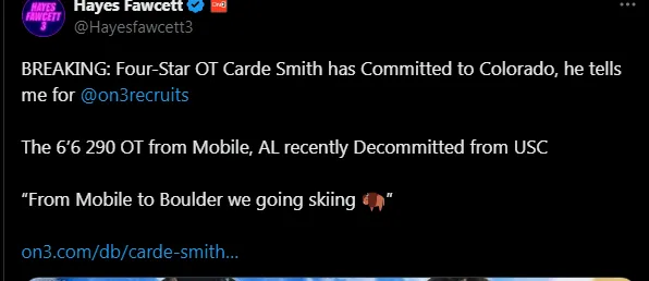 According to Hayes Fawcett, the 4-star OT decommitted from the USC Trojans—where he was expected to play a key role—to join the Buffaloes. The player in question is 6-foot-6, 290-pound Carde Smith. He had offers from Duke and Arkansas and visited Auburn and USC in June.