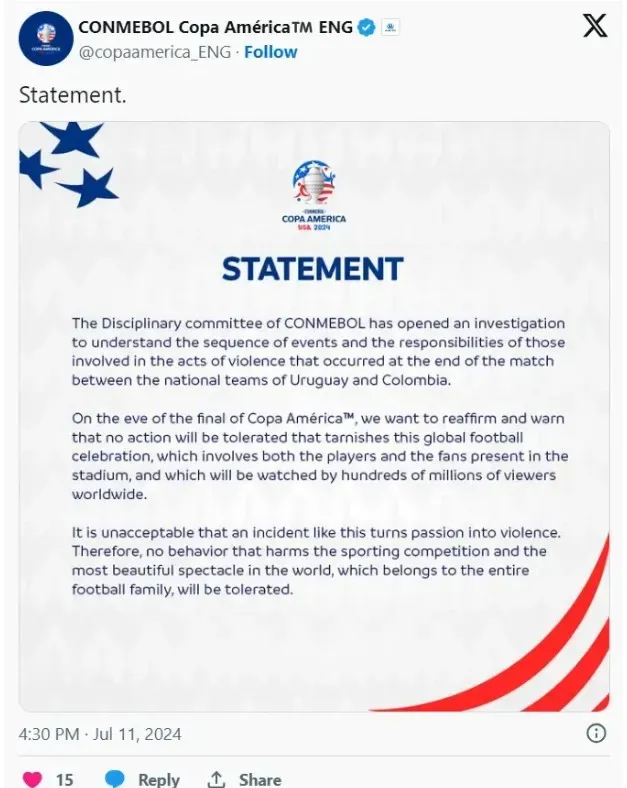 CONMEBOL has issued a statement strongly condemning any act of violence in football. The organization reiterates its commitment to the positive values of sport and calls for tolerance and respect on and off the field.