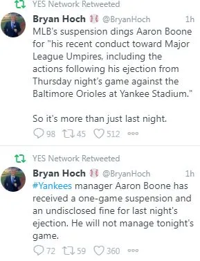 Due to his misconduct against the umpires, MLB decided to punish Boone with a one-game suspension, but that is the third time in the last 10 games that Boone has been ejected from a game.