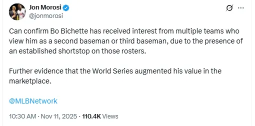 Can confirm Bo Bichette has received interest from multiple teams who view him as a second baseman or third baseman, due to the presence of an established shortstop on those rosters,” MLB Network’s Jon Morosi tweeted. “Further evidence that the World Series augmented his value in the marketplace.”