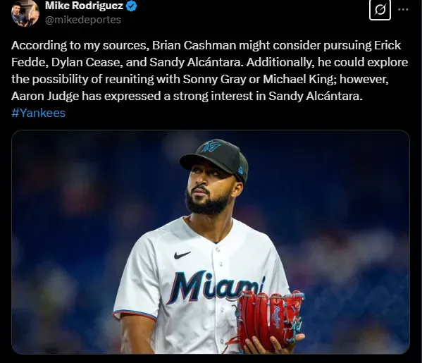 According to MLB insider Mike Rodriguez, Cashman has five pitchers on his radar, with three under strong consideration: Erick Fedde, Dylan Cease, and Sandy Alcántara. The latter is Aaron Judge’s top choice, as he views Alcántara as the best candidate to join the Yankees.